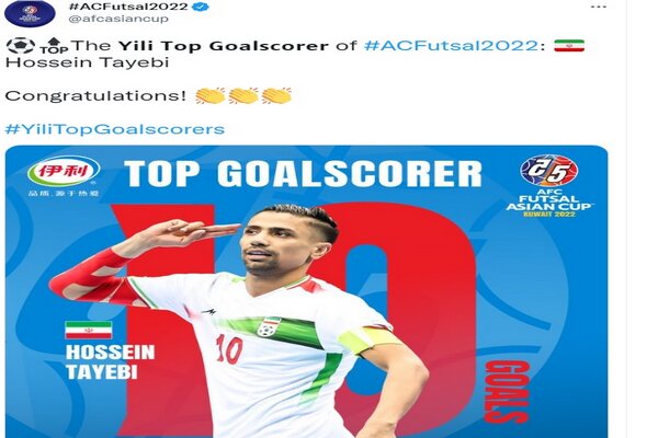 Asian Football Confederation (AFC) congratulated Iran’s futsal captain Hossein Tayebi on receiving the Yili Top Scorer award at the 16th edition of the Asian Futsal Cup.